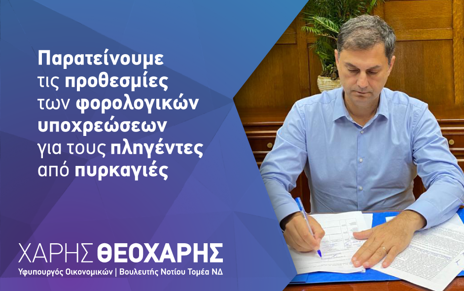 Λόγω των συνθηκών έκτακτης ανάγκης που έχουν διαμορφωθεί σε περιοχές της χώρας εξαιτίας των πυρκαγιών και με σκοπό τη διευκόλυνση πολιτών και επιχειρήσεων στην εκπλήρωση των φορολογικών υποχρεώσεών τους και την αξιοποίηση ευνοϊκών ρυθμίσεων, ο Υφυπουργός Οικονομικών κ. Θεοχάρης Θεοχάρης και ο Διοικητής της Ανεξάρτητης Αρχής Δημοσίων Εσόδων, κ. Γιώργος Πιτσιλής, υπέγραψαν σχετικές αποφάσεις ως ακολούθως: