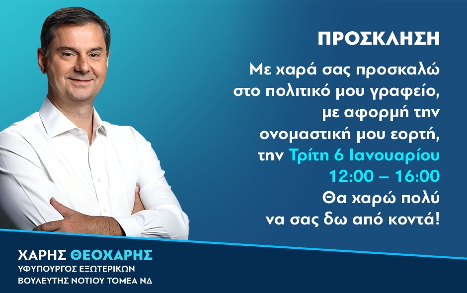 Με χαρά σας προσκαλώ στο πολιτικό μου γραφείο, Στριγγάρη 3, Αγ. Δημήτριος 173 41, με αφορμή την ονομαστική μου εορτή, την Τρίτη 6 Ιανουαρίου, από τις 12:00 έως τις 16:00.